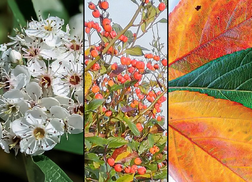Semis de mexicana x crus-galli. Grandes fleurs à cœur rouge. Feuilles oranges en automne. Fruits vermillons.